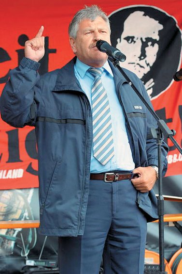 Ο ευρωβουλευτής του NPD Ούντο Βόιγκτ μπροστά σε φωτογραφία του ναζί Ρούντολφ Ες.