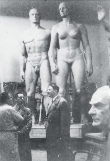Ο Χίτλερ επισκέπτεται το εργαστήριο του γλύπτη Γιόζεφ Τόρακ στο Μόναχο, Φεβρουάριο του 1937. Στα αριστερά του, διακρίνονται οι Γκέμπελς και Τόρακ. Στα δεξιά του... η προτομή του Μουσταφά Κεμάλ Ατατούρκ, ένα από τα αγαπημένα αντικείμενα του φύρερ (αριστερά).