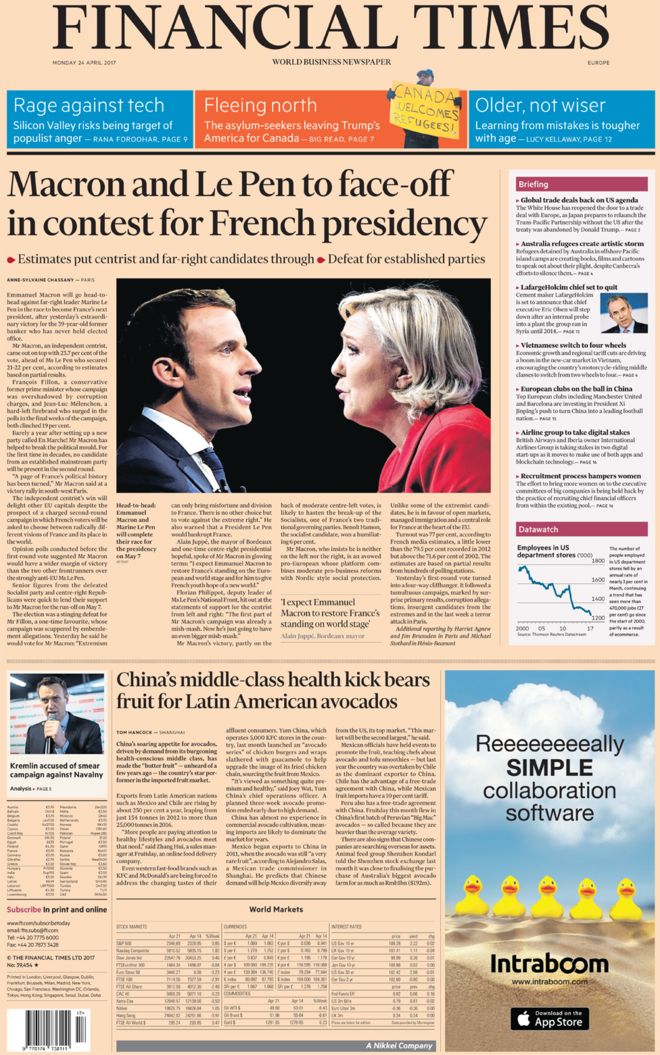 Οι Financial Times βλέπουν ήδη την «στέψη» του Μακρόν στον δεύτερο γύρο. Ωστόσο προειδοποιούν ότι ο 39χρονος θα είναι αναγκασμένος να διαπραγματευτεί σκληρά για να εφαρμόσει το πρόγραμμά του εάν εκλεγεί.
