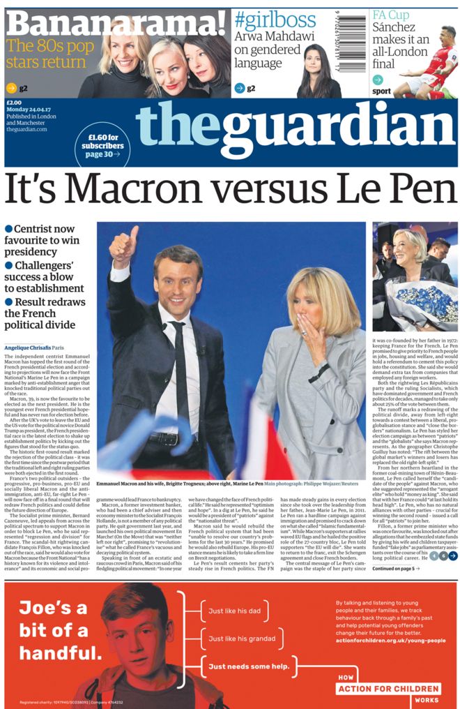 Ο Guardian θεωρεί ότι ο Εμανουέλ Μακρόν αποτελεί την «καλύτερη ελπίδα μίας μεγάλης χώρας με σοβαρά προβλήματα», αλλά θεωρεί ότι «η απειλή που θέτει η άκρα δεξιά δεν έχει σβήσει».