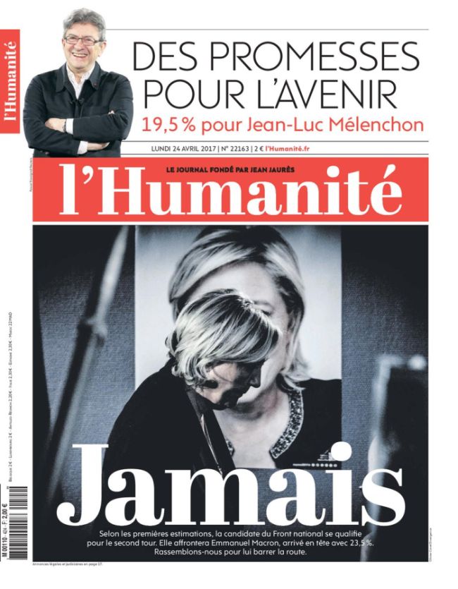 Έχει σε πρώτο πλάνο την ηγέτη του Εθνικού Μετώπου, με σκυμμένο το κεφάλι, να περνά μπροστά από μια αφίσα της. Και για τίτλο, μόνο μια λέξη: Jamais (Ποτέ).