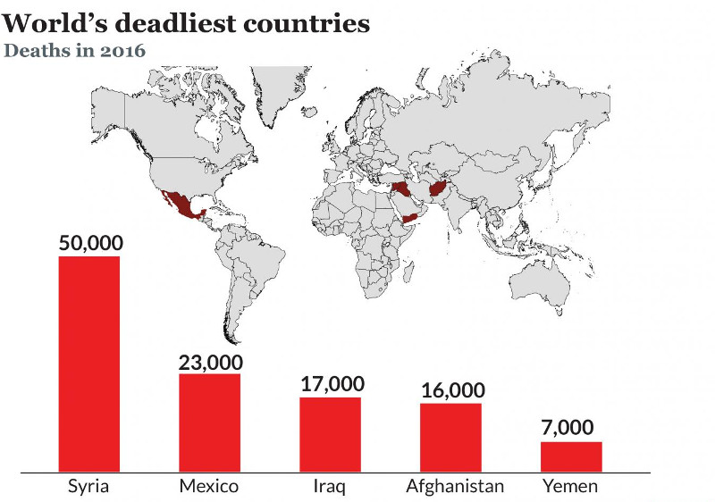 Το Διεθνές Ινστιτούτο Στρατηγικών Μελετών (IISS) αναφέρει σε έκθεσή του πως ο εξαετής πόλεμος στη Συρία αποτελεί την πιο θανατηφόρα ζώνη συγκρούσεων παγκοσμίως, για πέμπτο συνεχές έτος. Πιο συγκεκριμένα, το 2016 στη χώρα έχασαν τη ζωή τους 50.000 άνθρωποι.