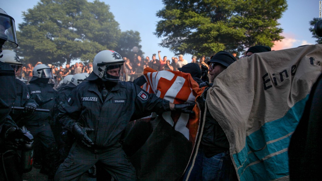 Όπως μεταδίδει το ΑΠΕ-ΜΠΕ, εξοπλισμένοι με μολότοφ και επιτιθέμενοι σε αυτοκίνητα, τα οποία πυρπόλησαν, οι διαδηλωτές απωθήθηκαν από την αστυνομία με δακρυγόνα και αντλίες νερού, πρόσθεσε η γερμανική αστυνομία.