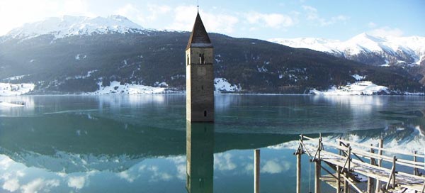 Η λίμνη Resia βρίσκεται στο Νότιο Τυρόλο, στο βόρειο τμήμα της Ιταλίας, και είναι μια τεχνητή λίμνη που δημιουργήθηκε όταν φράχθηκε το 1950 ένα κοντινό ποτάμι. Πολλά χωριά βυθίστηκαν εκτός από το καμπαναριό της εκκλησίας που υψώνεται αγέρωχο στην επιφάνεια της λίμνης.