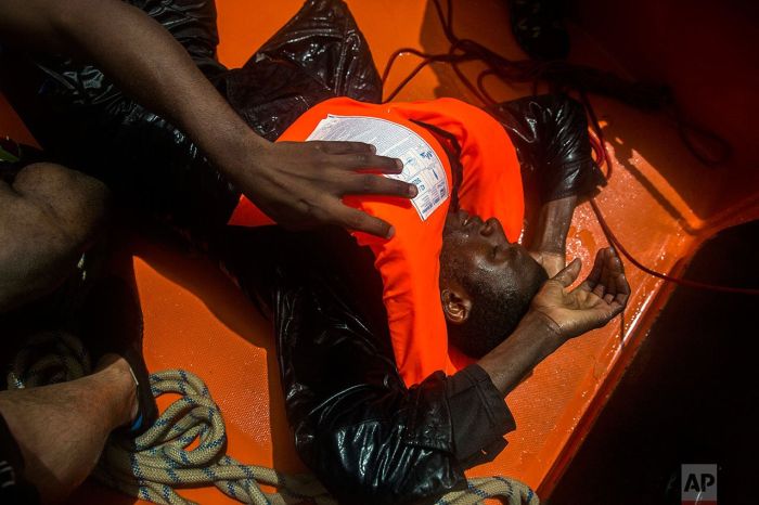 Άνθρωποι προσπαθούν απεγνωσμένα να πιαστούν από ένα σωσίβιο αποτυπώνεται στη μία φωτογραφία. Σε άλλες ένας σωρός από γυμνά και ημίγυμνα πτώματα στο κέντρο της βάρκας και άνθρωποι με σωσίβια γύρω του.