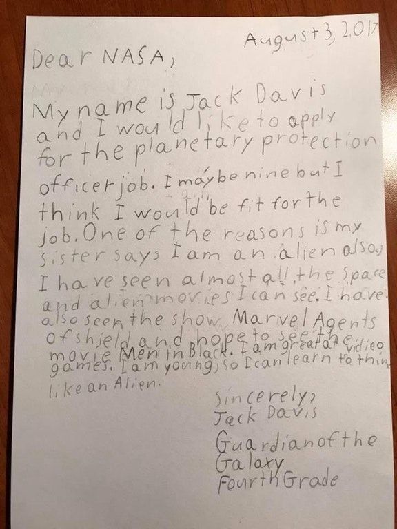 Ο 9χρονος Jack έστειλε πρόσφατα μια επιστολή αίτησης εργασίας στη NASA, η οποία και έγινε γρήγορα viral όταν ένα μέλος της οικογένειάς του την ανέβασε στο Reddit. Ο Jack υπέγραψε την επιστολή ως «Guardian of the Galaxy» (Φύλακας του Γαλαξία), και παρέθεσε μερικούς από τους λόγους οι οποίοι, σύμφωνα με τη γνώμη του, τον καθιστούν ικανό για τη θέση που είχε προκηρύξει πριν λίγες μέρες ο κρατικός οργανισμός εξερεύνησης του διαστήματος. Ας πούμε, έχει δει σχεδόν όλες τις ταινίες γύρω από το διάστημα και τους εξωγήινους που μπορούσε να δει, είναι καλός στα ηλεκτρονικά παιχνίδια και είναι νέος, πράγμα που σημαίνει πως έχει χρόνο «να μάθει να σκέφτεται σαν εξωγήινος».