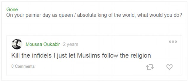 Ο 18χρονος Μούσα είναι Ισπανός υπήκοος με καταγωγή από το Μαρόκο. Στους λογαριασμούς του στα social media, ο 18χρονος Μούσα – κάτοικος της Βαρκελώνης- μπορεί να ποζάρει χαμογελαστός και να δείχνει πως ο τρόπος ζωής του είναι απόλυτα «δυτικός» αλλά σε άλλες αναρτήσεις του δεν έκρυβε το μίσος του για τους μη μουσουλμάνους!