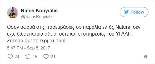 Ο Υπουργός Γεωργίας τοποθετήθηκε και μέσω ανάρτησης του στο twitter λέγοντας: "Όσον αφορά στις παρεμβάσεις σε παραλία εντός Natura, δεν έχω δώσει καμία άδεια, ούτε και οι υπηρεσίες του ΥΓΑΑΠ. Ζήτησα άμεσο τερματισμό!"