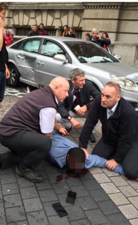 Όπως μπορεί να διακρίνει κανείς, έχει αίματα στο πρόσωπο, ενώ φαίνεται να είχε πάνω του τουλάχιστον δύο κινητά. Σύμφωνα με μαρτυρίες, οι δύο άνδρες που διακρίνονται στη φωτογραφία να τον κρατούν στο έδαφος, ήταν μεταξύ εκείνων που έπεσαν πάνω του και τον τράβηξαν έξω από το όχημα, ακινητοποιώντας τον.