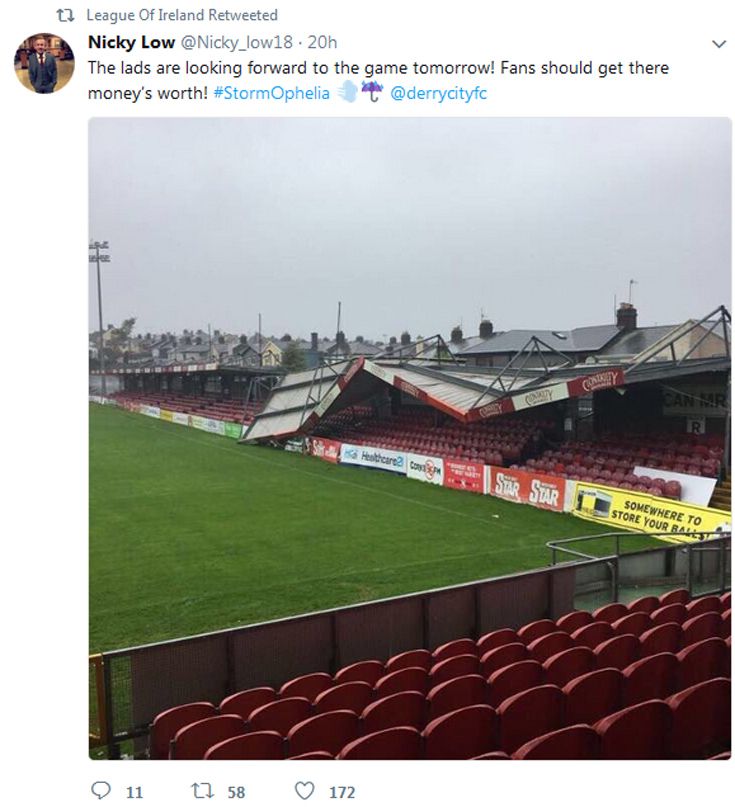 Ένα από τα «θύματα» του τυφώνα είναι και το γήπεδο της Κορκ Σίτι, της ομάδας της πόλης που χτυπήθηκε πρώτα από την Οφηλία. Ένα από τα σκέπαστρα του «Τέρνερ Κρος» καταστράφηκε, αλλά ευτυχώς -όπως αναφέρουν τα τοπικά ΜΜΕ- δεν έχει σημειωθεί κάποιος τραυματισμός.