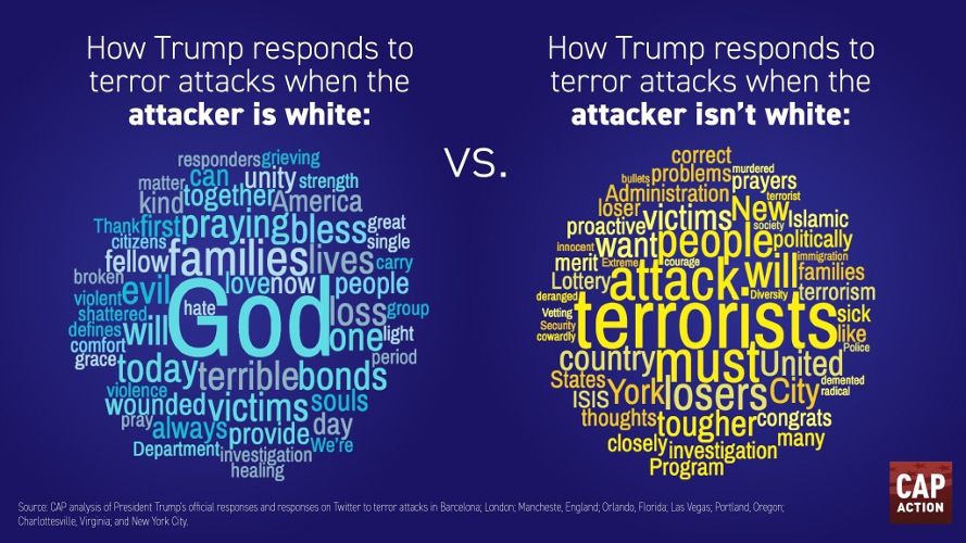 Αντιθέτως, όταν πρόκειται για μαύρο ή ασιάτη δράστη, τη σκυτάλη παίρνει η πολεμική ρητορική: Ισλάμ, τρομοκράτες, άρρωστος, εξτρεμισμός, loser, ISIS.