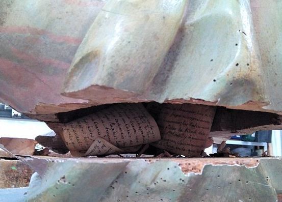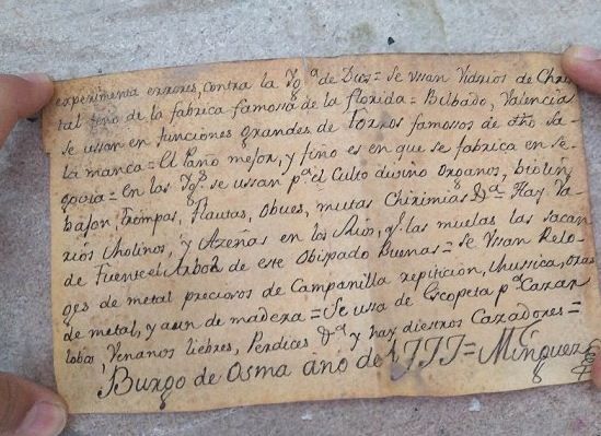 Ένα σημείωμα που έκρυψε ένας ιερέας κατά τον 18ο αιώνα μέσα σε ένα άγαλμα του Ιησού, ώστε να βρεθεί στο μέλλον από μελλοντικές γενιές ισχυρίζεται ότι ανακάλυψε ένα συνεργείο συντήρησης στην Ισπανία, χωρίς ωστόσο να έχει επιβεβαιωθεί μέχρι τώρα η ακριβής ηλικία του κρυμμένου κειμένου από τις επίσημες αρχαιολογικές υπηρεσίες της χώρας.