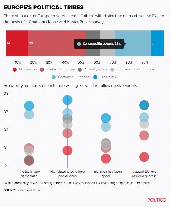 Η μεγαλύτερη πολιτική «φυλή», με ποσοστό 36% επί του δείγματος, είναι οι «διστακτικοί Ευρωπαίοι». Είναι υπερήφανοι που ανήκουν στην Ευρωπαϊκή Ενωση, αλλά ανησυχούν και για θέματα όπως η μετανάστευση. Όταν πρόκειται για την επιλογή μεταξύ της περαιτέρω ολοκλήρωσης της Ευρώπης και της εθνικής κυριαρχίας, τείνουν προς τη δεύτερη. Γενικότερα, τα μέλη αυτής της φυλής «βρίσκονται στη μέση για πολλά θέματα και κάθε φορά πρέπει να πείθονται για τα πλεονεκτήματα της ΕΕ», αναφέρει η έρευνα.