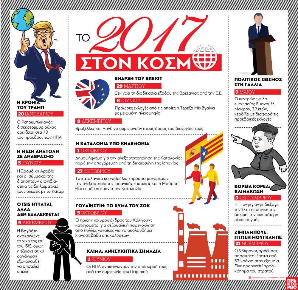 Από την ορκωμοσία του Ντόναλντ Τραμπ ως τις καταστροφικές επιπτώσεις της κλιματικής αλλαγής, περνώντας από την κρίση στην Καταλονία και την εκτόξευση βαλλιστικών πυραύλων από τη Βόρεια Κορέα, αυτά είναι τα κύρια γεγονότα του 2017.