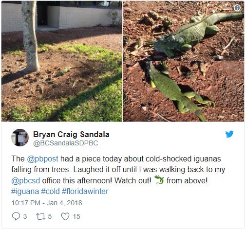 This fella better be gone by tonight cause temperature is dropping fast in the #MIA #305 to the low 40's. #Iguanas pic.twitter.com/JG4jDL96X0