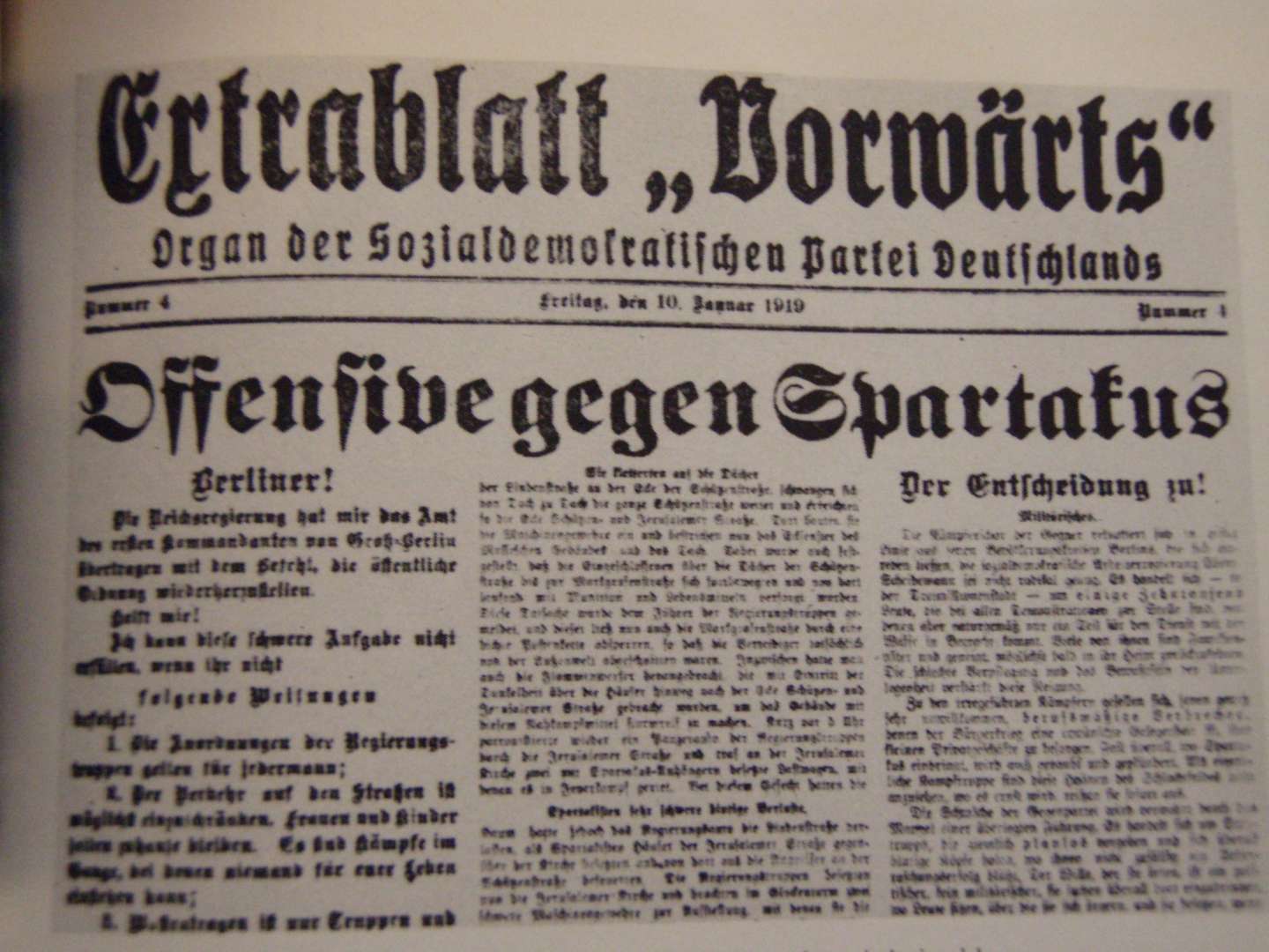 Στις 13 και 14 Ιανουαρίου του 1919, οι Σπαρτακιστές, οι Γερμανοί Κομμουνιστές της τιμημένης ομάδας Σπάρτακος, που, όχι πολύ πριν, ήταν η μόνη που αψήφησε τον Κάιζερ, και τον Λούντερντολφ πολεμούσαν στους δρόμους τους Βερολίνου κατά των στρατευμάτων της σοσιαλιστικής Κυβέρνησης. Η κυβέρνηση είχε προκαλέσει την εξέγερση απομακρύνοντας τον αρχηγό της κόκκινης αστυνομίας του Βερολίνου, τον σύντροφό μας Αϊχορν.