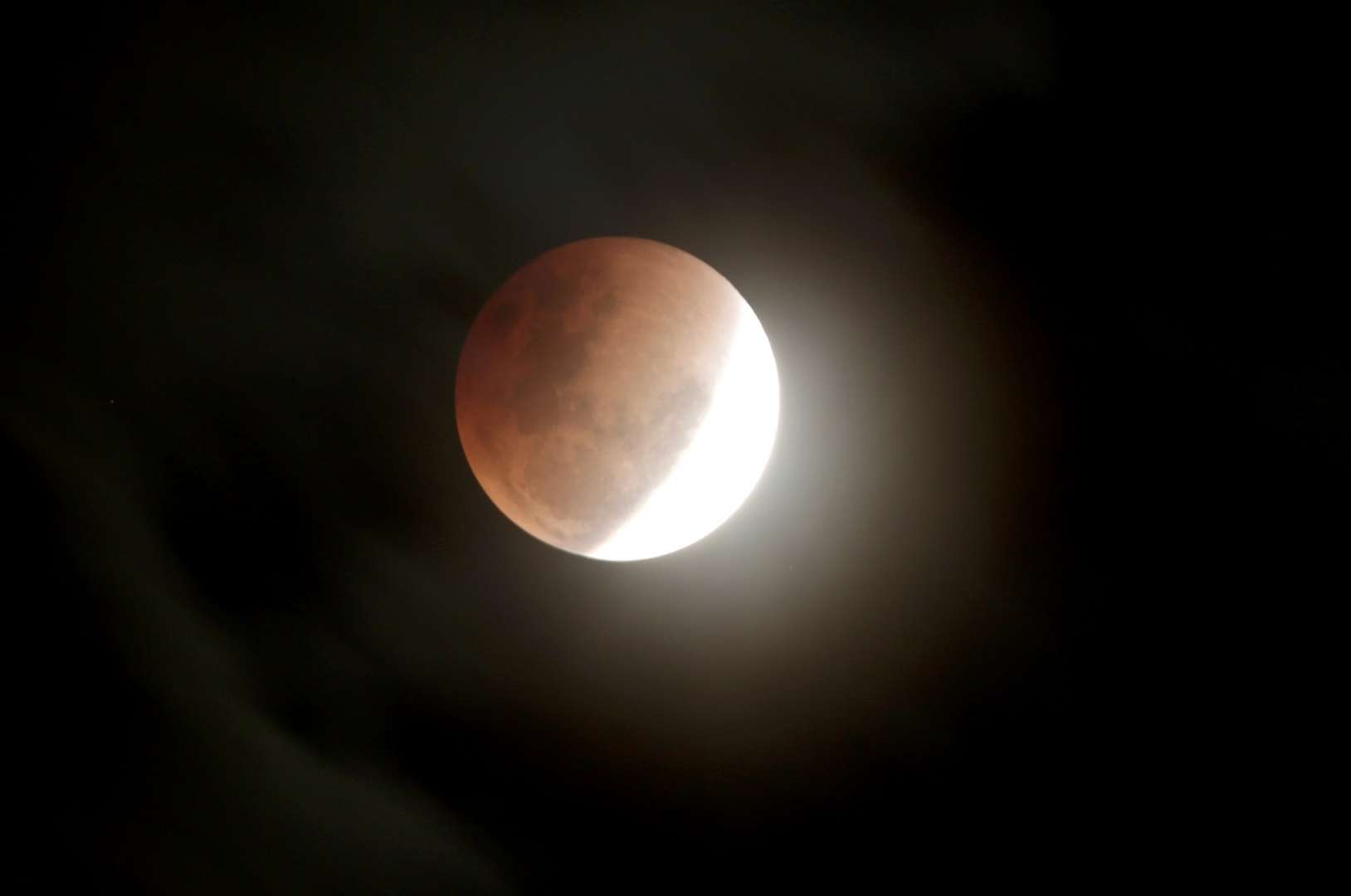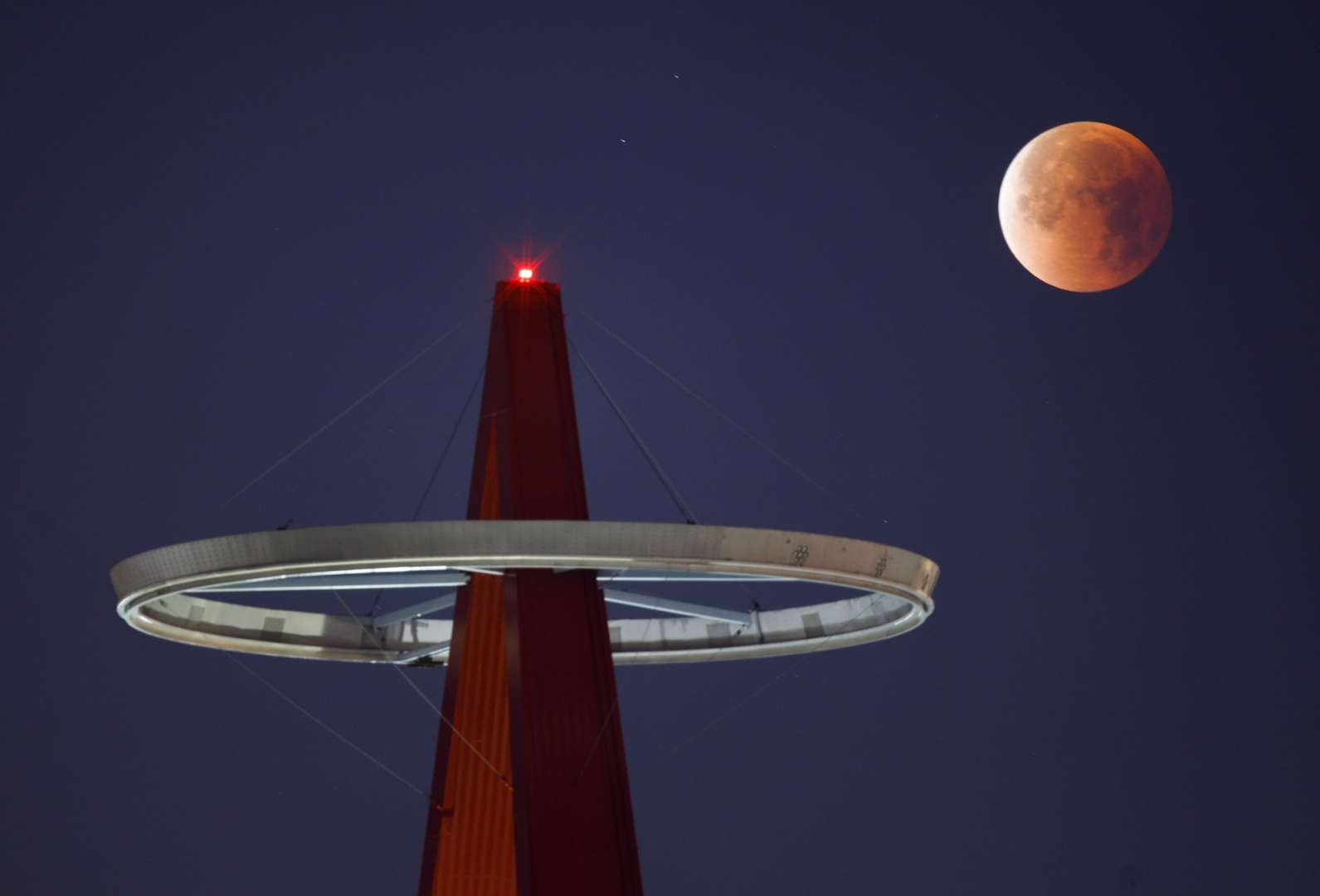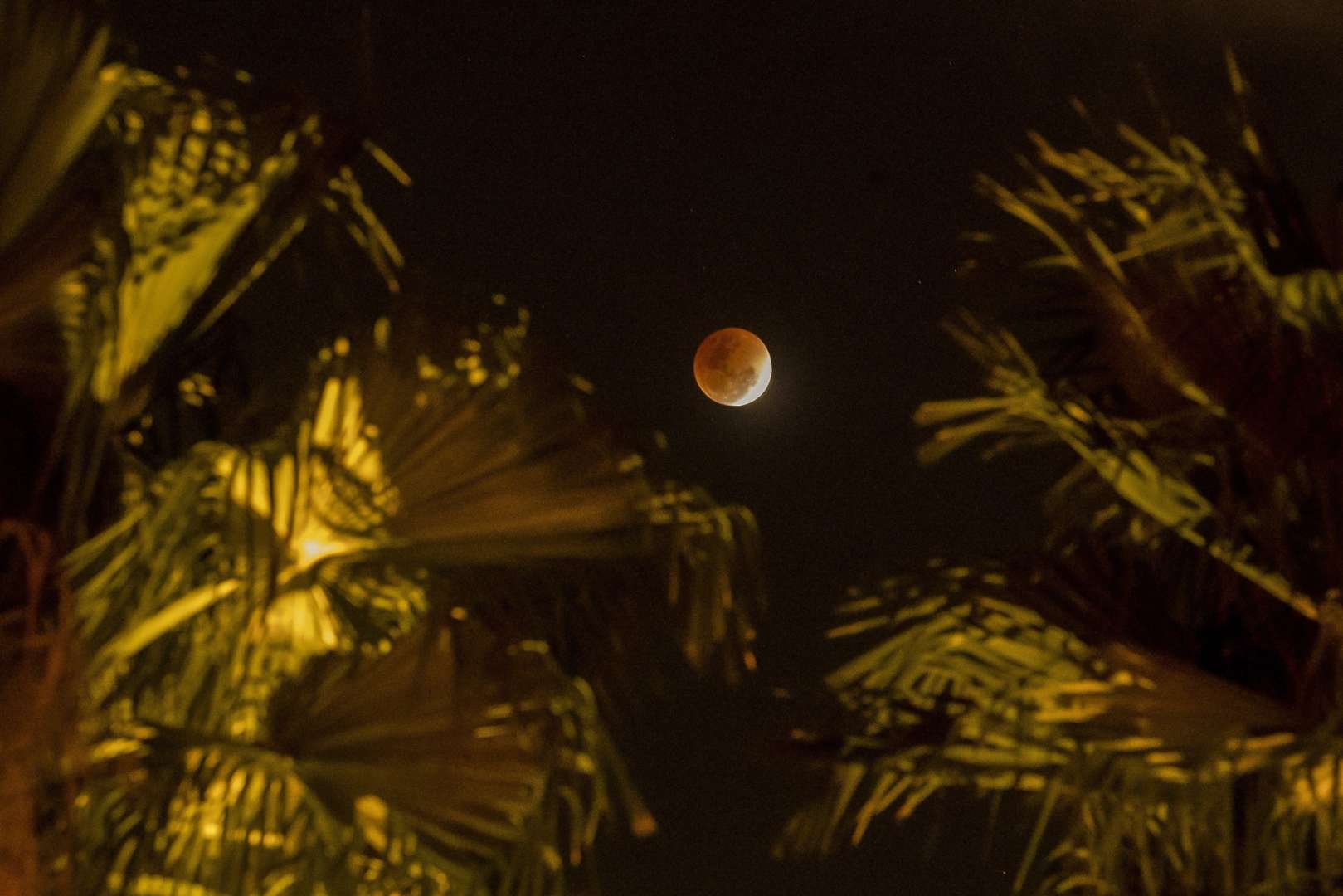 Χιλιάδες άνθρωποι συγκεντρώθηκαν στην Καλιφόρνια για να δουν τη Σελήνη να χάνεται, κρυμμένη από τη σκιά της Γης και μετά να επανεμφανίζεται κατακόκκινη, εξ ου και η ονομασία "ματωμένο φεγγάρι".