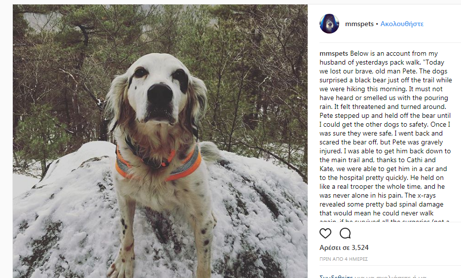 Ένα αγγλικό σέτερ 14 ετών, ο Πιτ, θυσιάστηκε για να σώσει το αφεντικό του και τρία ακόμα κουτάβια από επίθεση μαύρης αρκούδας