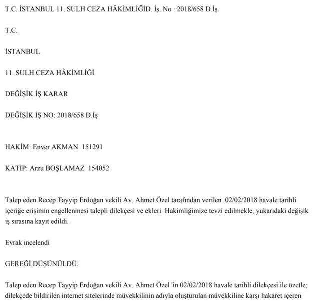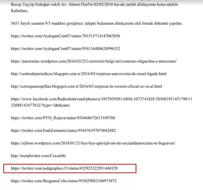 Το έγγραφο του τουρκικού δικαστηρίου περιλαμβάνει μια σειρά από 80 δημοσιεύσεις σε Twitter, Facebook, άλλα κοινωνικά δίκτυα αλλά και διευθύνσεις διάφορων blogs, από τις οποίες απαιτείται η διαγραφή περίπου 80 δημοσιεύσεων (κυρίως σκίτσων και εικόνων) που αφορούν στις δράσεις του Erdogan.