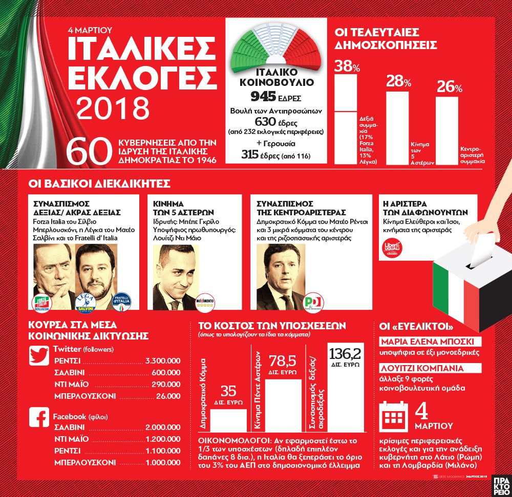 Τον βαθμό απροσδιοριστίας για τον σχηματισμό κυβέρνησης έχει αυξήσει αφ? ενός ο εκλογικός νόμος, που αποτελεί ένα «υβρίδιο» απλής αναλογικής (από το οποίο θα αναδειχθεί το 64% των εδρών) και μονοεδρικών (που θα καλύψουν το υπόλοιπο 36% του απαιτούμενου αριθμού των 630 βουλευτών και 315 Γερουσιαστών). Ο νόμος αυτός -ο αποκαλούμενος Rosatellum- θεωρείται πως συντάχθηκε για να ευνοήσει τις μεγάλες κομματικές συμμαχίες (της Κεντροδεξιάς, που αποτελείται από το Forza Italia του Σίλβιο Μπερλουσκόνι, την ξενοφοβική Λέγκα του Βορρά του Ματέο Σαλίβνι και το νεοφασιστικό «Αδέλφια της Ιταλίας» (Fratteli d? Italia) της Τζόρτζα Μελόνι) και της Κεντροαριστεράς (με επικεφαλής το κυβερνών Δημοκρατικό Κόμμα (PD)του Ματέο Ρέντσι και του νυν πρωθυπουργού Πάολο Τζεντιλόνι), που κατεβάζουν κοινά αποδεκτούς υποψηφίους, από τα μεμονωμένα κόμματα, ιδίως δε το ανερχόμενο Κίνημα των 5 Αστέρων του κωμικού Μπέπε Γκρίλο, που λόγω καταδίκης του για φοροδιαφυγή δεν μπορεί να εκλεγεί και άφησε την ηγεσία στον 31 ετών Λουΐτζι Ντι Μάιο.