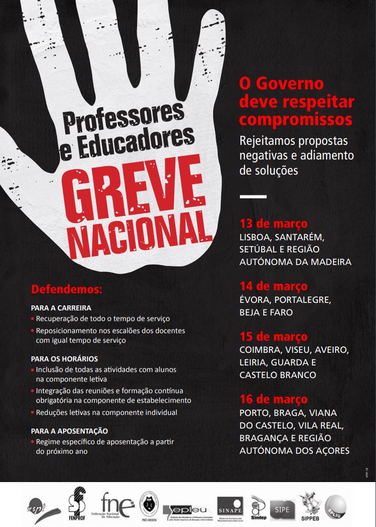 Οι καθηγητές ανταποκρίθηκαν στο κάλεσμα για απεργία, δήλωσε ο Μάριο Νογκέιρα, γενικός γραμματέας της Εθνικής Ομοσπονδίας Καθηγητών (Fenprof), ο οποίος εκτιμά ότι το ποσοστό συμμετοχής ξεπερνά το 60%.