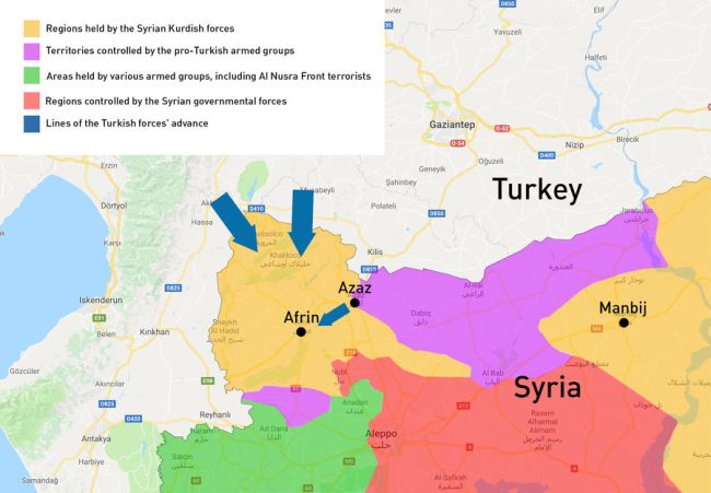 Όπως φαίνεται και στον χάρτη του RT, το Αφρίν βρίσκεται αποκομμένο από τις υπόλοιπες εκτάσεις της κουρδικής επικράτειας που βρίσκονται ανατολικά στη Συρία και φτάνουν μέχρι το Ιράκ, οπότε και η αντίσταση στον στρατό του Ερντογάν θα ήταν εξαρχής δύσκολη υπόθεση.