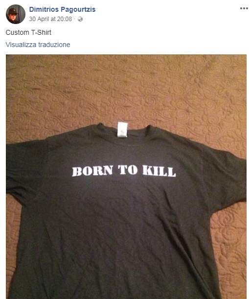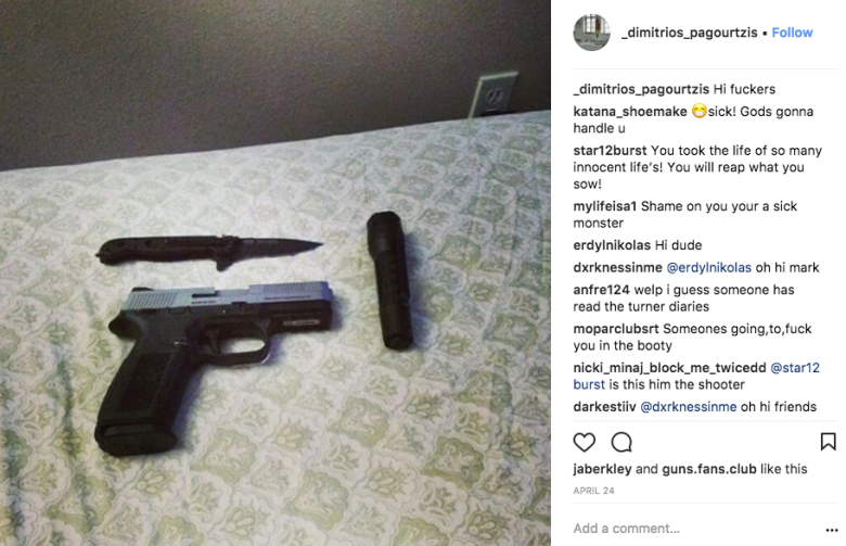 Φωτογραφίες που ανέβαζε στα social media απεικόνιζαν πιστόλια, μαχαίρια, ναζιστικά σύμβολα, ενώ απαθανάτισε και ένα μπλουζάκι του που έγραφε «Born to kill» (Γεννημένος να σκοτώνει). Τα δε follow και like του σχετίζονταν κατά κύριο λόγο με σελίδες που είχαν να κάνουν με όπλα.