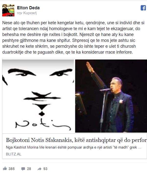 Σε ανάρτηση του στον λογαριασμό του στο facebook, ο δημοφιλής Αλβανός τραγουδιστής της ροκ, Έλτον Ντέντα, έγραψε: