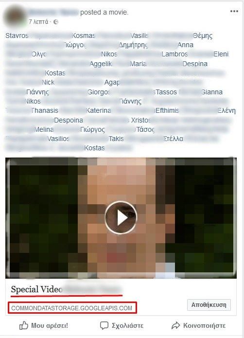 Όπως μπορεί να έχετε ήδη παρατηρήσει, φίλοι σας μπορεί κάνουν μια ανάρτηση με την μορφή βίντεο που φέρει την ένδειξη «Commondatastorage Googleapis», ενώ έχει κάνει tag το όνομα πολλών φίλων, όπως στην εικόνα: