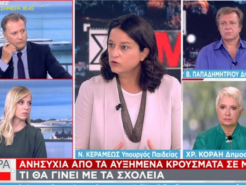 Μιλώντας στον ΣΚΑΙ, η υπουργός Παιδείας είπε πως η επιδημιολογική κατάσταση στα σχολεία, παρακολουθείται πολύ στενά με την αρωγή των ειδικών και του Υπουργείου Υγείας, σημειώνοντας πως μετά από δύο πλήρης εβδομάδες λειτουργίας των σχολείων έχουμε λιγότερα κρούσματα απ’ ότι είχαμε τον Αύγουστο όταν τα σχολεία ήταν κλειστά.