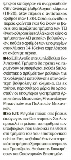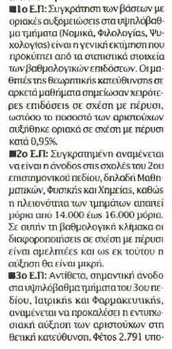Όπως αναφέρουν στο Ρεπορτάζ τους στο ΕΘΝΟΣ, οι Ν.Τρίγκα και Μ.Νιβολιανίτης, σημαντική άνοδος αναμένεται στα υψηλόβαθμα τμήματα του 3ου και του 4ου επιστημονικού πεδίου (Ιατρικά Και Πολυτεχνικά), μεγάλη πτώση στις Οικονομικές σχολές του 5ου επιστημονικού πεδίου και μικρότερη στα περιζήτητα τμήματα των ΤΕΙ του 3ου επιστημονικού Πεδίου (φυσικοθεραπεία, Μαιαευτικής), συγκράτηση των βάσεων με οριακές αυκομειώσεις στα περιζήτητα τμήματα του 1ου πεδίου (Νομικά, Ψυχολογίας, Φιλολογίας) και συγκρατημένη άνοδος στις σχολές του 2ου πεδίου (φυσικομαθηματικές). Αναφορικά ,με τις στρατιωτικές σχολές αναμένεται ότι θα υπάρχουν αυξομειώσεις.
