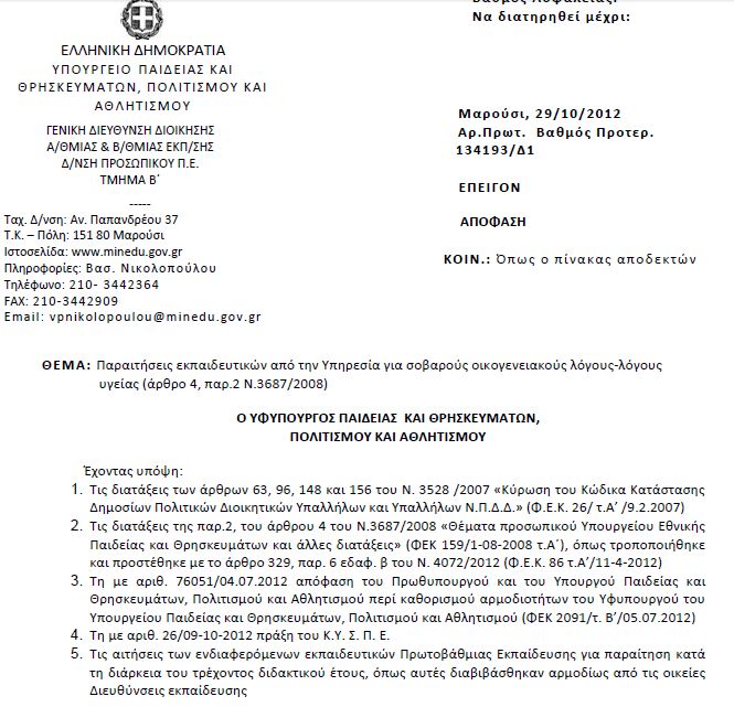 06.11.2012 - 12:00 Παραιτήσεις εκπαιδευτικών από την Υπηρεσία για σοβαρούς οικογενειακούς λόγους ή υγείας Υπουργείο Παιδείας: Παραιτήσεις εκπαιδευτικών από την Υπηρεσία για σοβαρούς οικογενειακούς λόγους-λόγους υγείας ΑΝΑΚΟΙΝΩΣΕΙΣ Παραιτήσεις εκπαιδευτικών από την Υπηρεσία για σοβαρούς οικογενειακούς λόγους ή υγείας