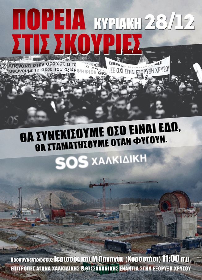 Πορεία στις Σκουριές διοργανώνουν την Κυριακή 28 Δεκεμβρίου οι Επιτροπές αγώνα Χαλκιδικής και Θεσσαλονίκης ενάντια στην εξόρυξη χρυσού