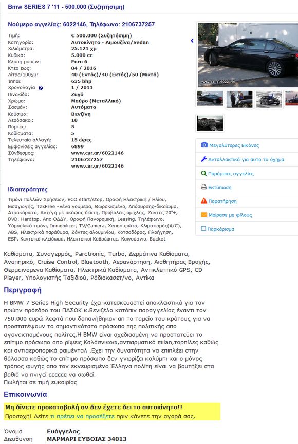 Η αγγελία αναρτήθηκε στο site car.gr ,και δείχνει το αυτοκίνητο μάρκας BMW που χρησιμοποιούσε ο Ευάγγελος Βενιζέλος για τις μετακινήσεις του,έτοιμο προς πώληση ύστερα από απόφαση την νέας κυβέρνησης στην “προνομιακή” τιμή των 500,000€ ΜΟΝΟ .Το περίεργο της υπόθεσης είναι -εκτός του ότι η αγγελία είναι τρολιά- ότι η BMW έχει απίστευτα extra όπως προστασία από καλάσνικοφ,αντιαρματικά(!) κτλ