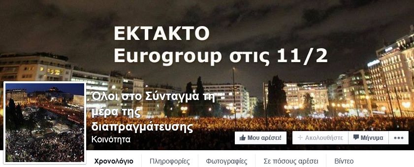 1) Ένα από τα πρώτα κεντρικά event στο Facebook για τις 11/02 είναι το Παλλαικό συλλαητήριο σε Σύνταγμα και Λευκό Πύργο όταν η ελληνική αντιπροσωπεία μεταβεί στις βρυξέλλες να διαπραγματευτεί το ελληνικό χρέος το οποίο ανακοινώνει: