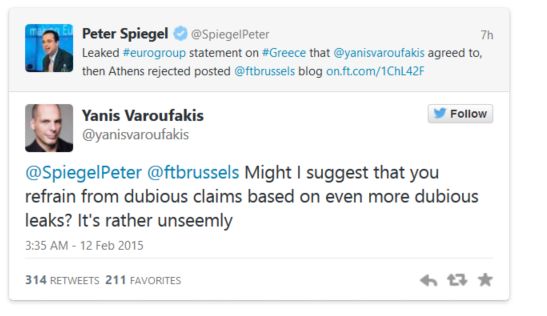Η εφημερίδα γράφει ότι αρχικά ο υπουργός Οικονομικών της Ελλάδας, Γιάννης Βαρουφάκης, είχε συμφωνήσει σε μια κοινή δήλωση με τους συναδέλφους του. Μάλιστα η εφημερίδα γράφει ότι η δήλωση είχε υπογραφεί από τον αντιπρόεδρο της κυβέρνησης Γιάννη Δραγασάκη, ο οποίος ήταν επίσης παρών στο Eurogroup. Μόλις αυτή εγκρίθηκε η συνεδρίαση του Eurogroup διαλύθηκε και ο Σόιμπλε με αρκετούς από τους συναδέλφους του, αποχώρησαν. Αλλά τότε τελευταία στιγμή ο έλληνας υπουργός Οικονομικών έκανε μια τελευταία κλήση πίσω στην Αθήνα για να ενημερώσει για το τι είχε μόλις συμφωνηθεί – και τότε κυβερνητικοί αξιωματούχοι απέρριψαν την ανακοίνωση.