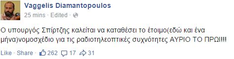 Ο βουλευτής του ΣΥΡΙΖΑ, Βαγγέλης Διαμαντόπουλος μέσω της προσωπικής του σελίδας στο Facebook ζητάει από τον αναπληρωτής Υπουργό Υποδομών, Μεταφορών και Δικτύων να καταθέσει το "έτοιμο (εδώ και ένα μήνα) νομοσχέδιο για τις ραδιοτηλεοπτικές συχνότητες Αύριο το πρωί"