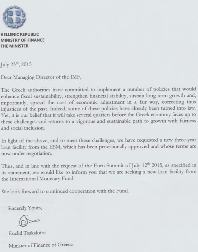 «Κατ' εφαρμογή της απόφασης της Συνόδου Κορυφής της 12ης Ιουλίου 2015, σας ενημερώνουμε ότι αιτούμεθα μίας νέας δανειακής διευκόλυνσης από το Διεθνές Νομισματικό Ταμείο» αναφέρεται στην επιστολή.