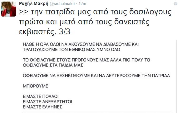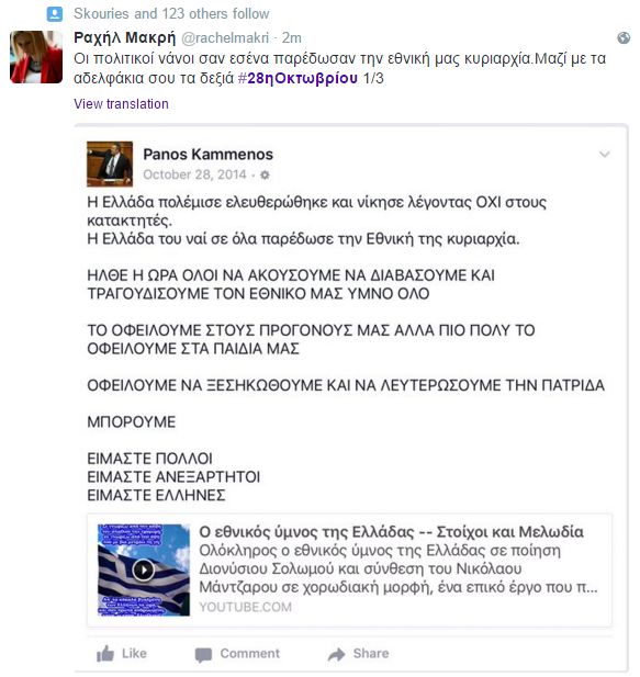 Η Ραχήλ Μακρή δεν άφησε αναπάντηση την ανάρτηση του Πάνου Καμμένου στο λογαριασμό του στο twitter όπου έγραψε "Η Ελλάδα πολέμισε ελευθερώθηκε και νίκησε λέγοντας ΟΧΙ στους κατακτητές. Η Ελλάδα του ναι σε όλα παρέδωσε την Εθνική της κυριαρχία ..." Να σημειώσουμε ότι η ανάρτηση του Πάνου Καμμένου έγινε στην περσινή επέτειο της 28ης Οκτωβρίου.