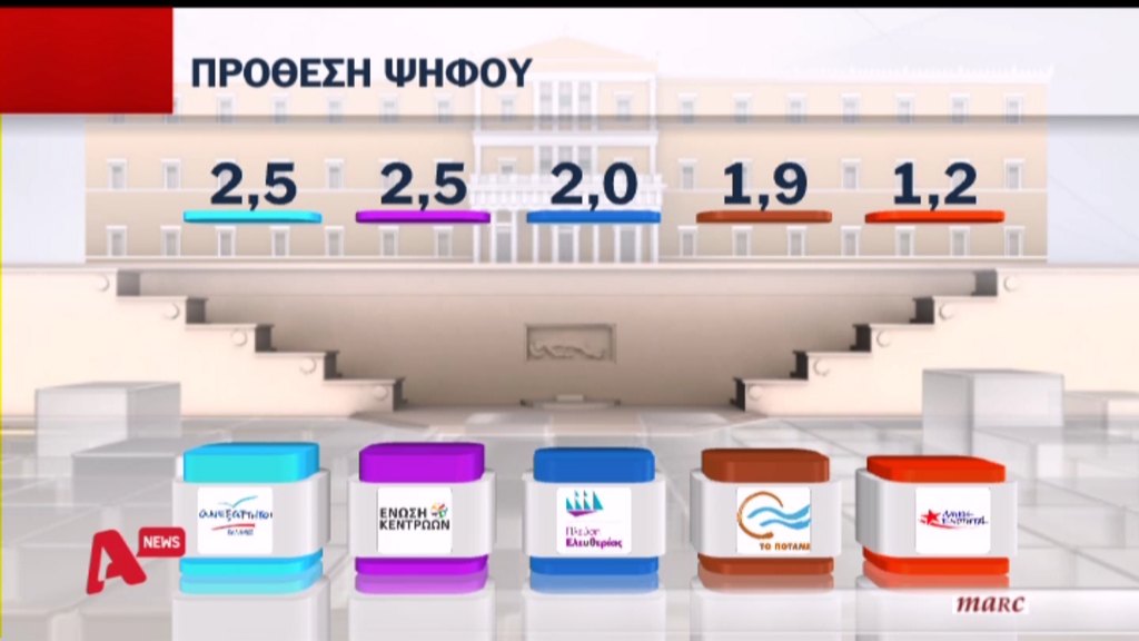 Προβάδισμα 7,5 ποσοστιαίων μονάδων στη Νεά Δημοκρατία έναντι του ΣΥΡΙΖΑ δίνει νέα δημοσκόπηση της εταιρείας Marc για λογαριασμό του τηλεοπτικού σταθμού ΑLPHA.