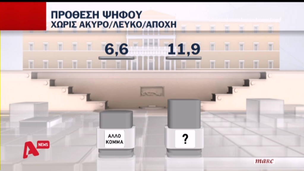 Άλλο κόμμα επιλέγει το 5,3% των ερωτηθέντων, ενώ το 7,5% δηλώνει ότι θα ψηφίσει λευκό ή άκυρο.
