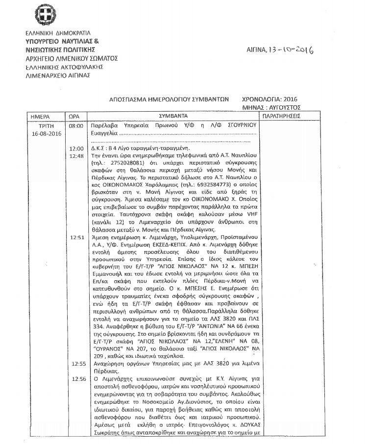 Απόσπασμα από το ημερολόγιο συμβάντων του Λιμεναρχείου Αίγινας, την ώρα που καταγράφηκε για πρώτη φορά η ειδοποίηση για τη μοιραία σύγκρουση των δύο σκαφών στο νησί, στις 16 Αυγούστου, έδωσε σήμερα στη δημοσιότητα, ο υπουργός Ναυτιλίας Θοδωρής Δρίτσας, μετά τα όσα υποστήριξε ο τομεάρχης ναυτιλίας της Ν.Δ, Σίμος Κεδίκογλου, ότι το Λιμενικό ήταν ενήμερο από τις 12:30 το μεσημέρι για το συμβάν.