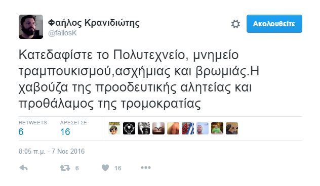 Ζητά την κατεδάδιση του ίδιου του ιστορικού κτιρίου του Πολυτεχνείου, καθώς, σύμφωνα με τα γραπτά του στο Twitter, το θεωρεί "μνημείο τραμπουκισμού, ασχήμιας και βρωμιάς" μια "χαβούζα της προοδευτικής αλητείας και προθάλαμος της τρομοκρατίας".