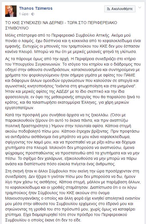 Μόλις επέστρεψα από το Περιφερειακό Συμβούλιο Αττικής. Ακόμα μού πονάει ο λαιμός, έχω δύσπνοια και η κοκκινίλα από το κεφαλοκλείδωμα είναι εμφανής. Ευτυχώς οι μπουνιές του τραμπούκου του ΚΚΕ δεν μου έσπασαν κανένα πλευρό. Μπορώ να πω ότι με μερικές μελανιές φτηνά τη γλύτωσα.