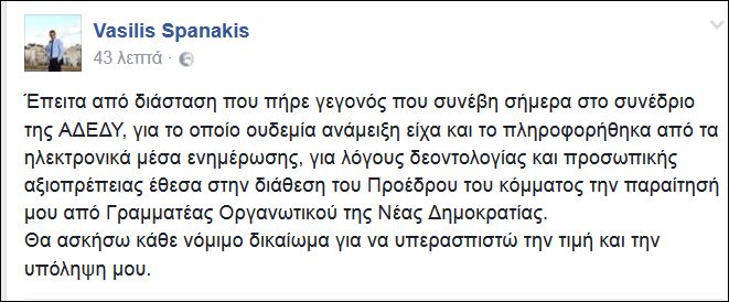 «Έπειτα από διάσταση που πήρε γεγονός που συνέβη σήμερα στο συνέδριο της ΑΔΕΔΥ, για το οποίο ουδεμία ανάμειξη είχα και το πληροφορήθηκα από τα ηλεκτρονικά μέσα ενημέρωσης, για λόγους δεοντολογίας και προσωπικής αξιοπρέπειας έθεσα στην διάθεση του Προέδρου του κόμματος την παραίτησή μου από Γραμματέας Οργανωτικού της Νέας Δημοκρατίας.