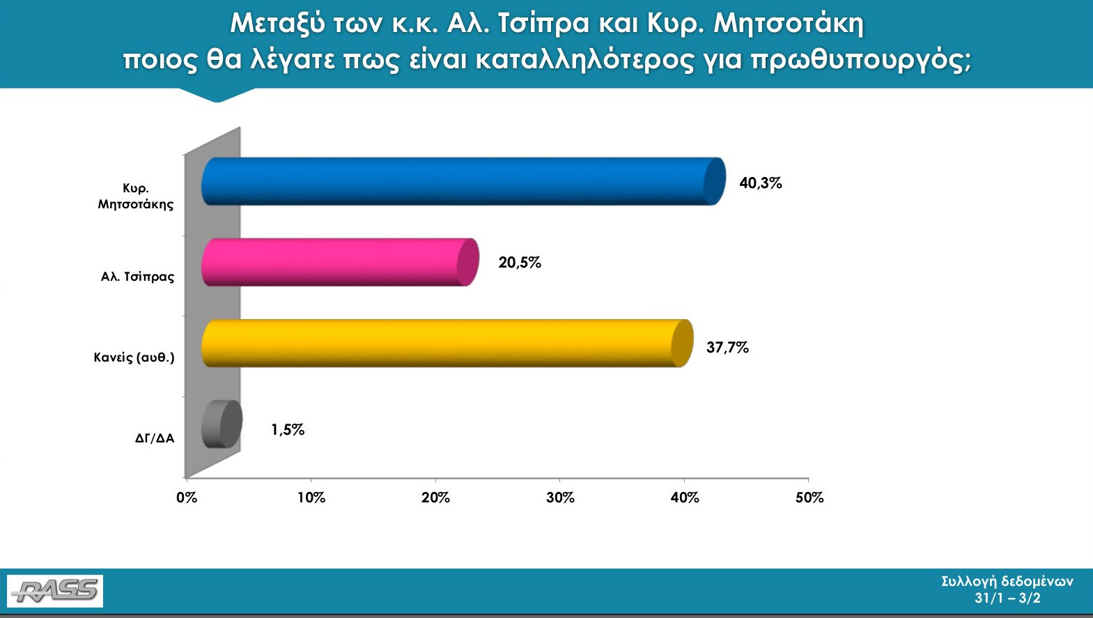 Καταλληλότερος πρωθυπουργός αναδεικνύεται ο Κυριάκος Μητσοτάκης με 40,3%, ενώ ο Αλέξης Τσίπρας συγκεντρώνει 20,5%. Κανείς από τους δύο συγκετνρώνει το 37,7% της γνώμης των ερωτηθέντων.