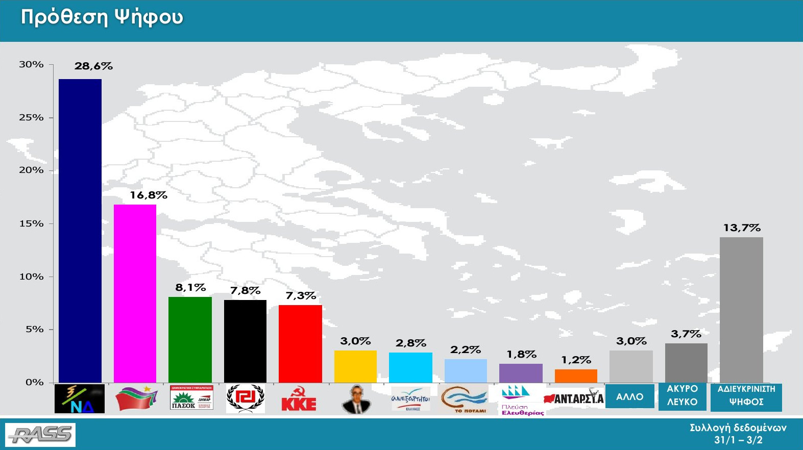 Συγκεκριμένα, η Ν.Δ συγκεντρώνει το 28,6% των προτιμήσεων των ερωτηθέντων και ακολουθεί ο ΣΥΡΙΖΑ με 16,8%. Τρίτη έρχεται η Δημοκρατική Συμπαράταξη με 8,1%, τέταρτη η Χρυσή Αυγή με 7,8%, ακολουθούν το ΚΚΕ με 7,3% και η Ενωση Κεντρώων 3%.