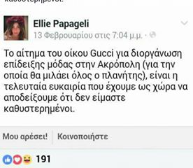 Σύμφωνα με το γνωστό μοντέλο, μέλος της ΟΝΝΕΔ και θαυμάστρια του Άδωνη Γεωργιάδη, Έλλη Παπαγγελλή, τελευταία ευκαιρία της Ελλάδας είναι η πασαρέλα στην Ακρόπολη. Για να αποδείξουμε στους Ευρωπαίους, ως Έλληνες ιθαγενείς, ότι δεν είμαστε και τόσο καθυστερημένοι, αφού είμαστε πρόθυμοι για ακόμη μια φορά να ανταλλάξουμε την αξιοπρέπεια μας με αντάλλαγμα λίγα Gucci καθρεφτάκια.