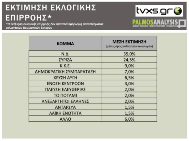 Πιο αναλυτικά, στην εκτίμηση εκλογικής επιρροής (με πολλαπλή αναγωγή) η ΝΔ συγκεντρώνει 35%, ο ΣΥΡΙΖΑ 24,5%, το ΚΚΕ 9,0%, η Δημοκρατική Συμπαράταξη 7,0%, η Χρυσή Αυγή 6,5%, η Ένωση Κεντρώων 3%, η Πλεύση Ελευθερίας 2%, το Ποτάμι 2%, οι Ανεξάρτητοι Έλληνες 2%, 1,5% η ΑΝΤΑΡΣΥΑ και 1,5% η Λαϊκή Ενότητα. Το 6% των ερωτηθέντων δήλωσε πως θα ψηφίσει «Άλλο Κόμμα».