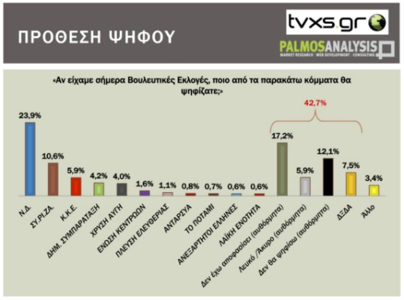 Στην πρόθεση ψήφου (ερώτηση: «αν είχαμε σήμερα βουλευτικές εκλογές, ποιο κόμμα θα ψηφίζατε»), το 23,9% των ερωτηθέντων δηλώνει ΝΔ. Ο ΣΥΡΙΖΑ καταλαμβάνει το 10,6%, ενώ ακολουθούν: ΚΚΕ 5,9%, Δημοκρατική Συμπαράταξη 4,2%, Χρυσή Αυγή 4%, Ένωση Κεντρώων 1,6%, Πλεύση Ελευθερίας 1,1%, ΑΝΤΑΡΣΥΑ 0,8%, Ποτάμι 0,7%, Ανεξάρτητoι Έλληνες 0,6% και Λαϊκή Ενότητα 0,6%. «Άλλο κόμμα» δήλωσε πως θα ψηφίσει το 3,4%. «Δεν έχω αποφασίσει ακόμα» απάντησε το 17,2%, ενώ «Δεν ξέρω, δεν απαντώ» είπε το 7,5%. «Δεν θα ψηφίσω» δήλωσε το 12,1% και «Λευκό / Άκυρο» είπε το 5,9%.